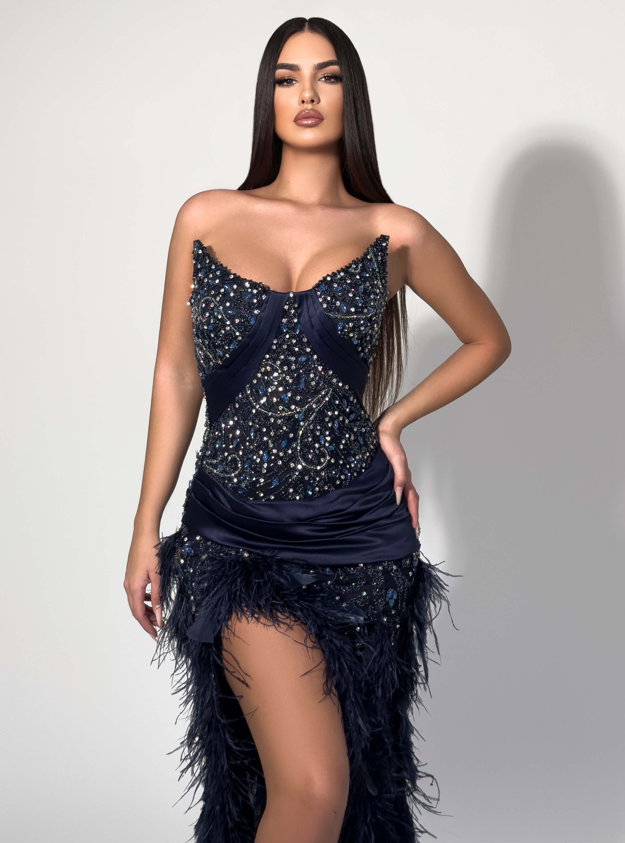 - Dramatic feather-trimmed skirt with high slit