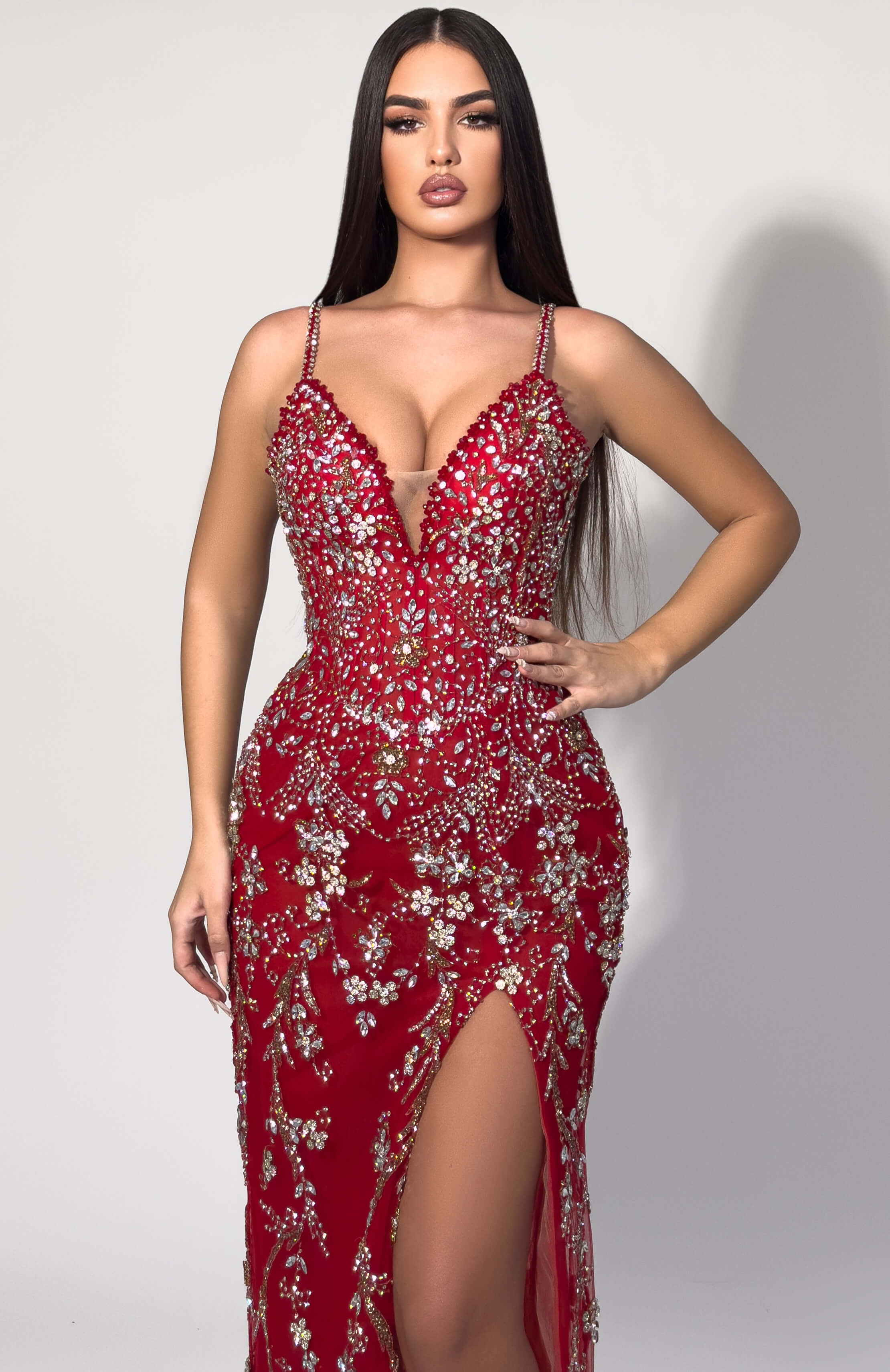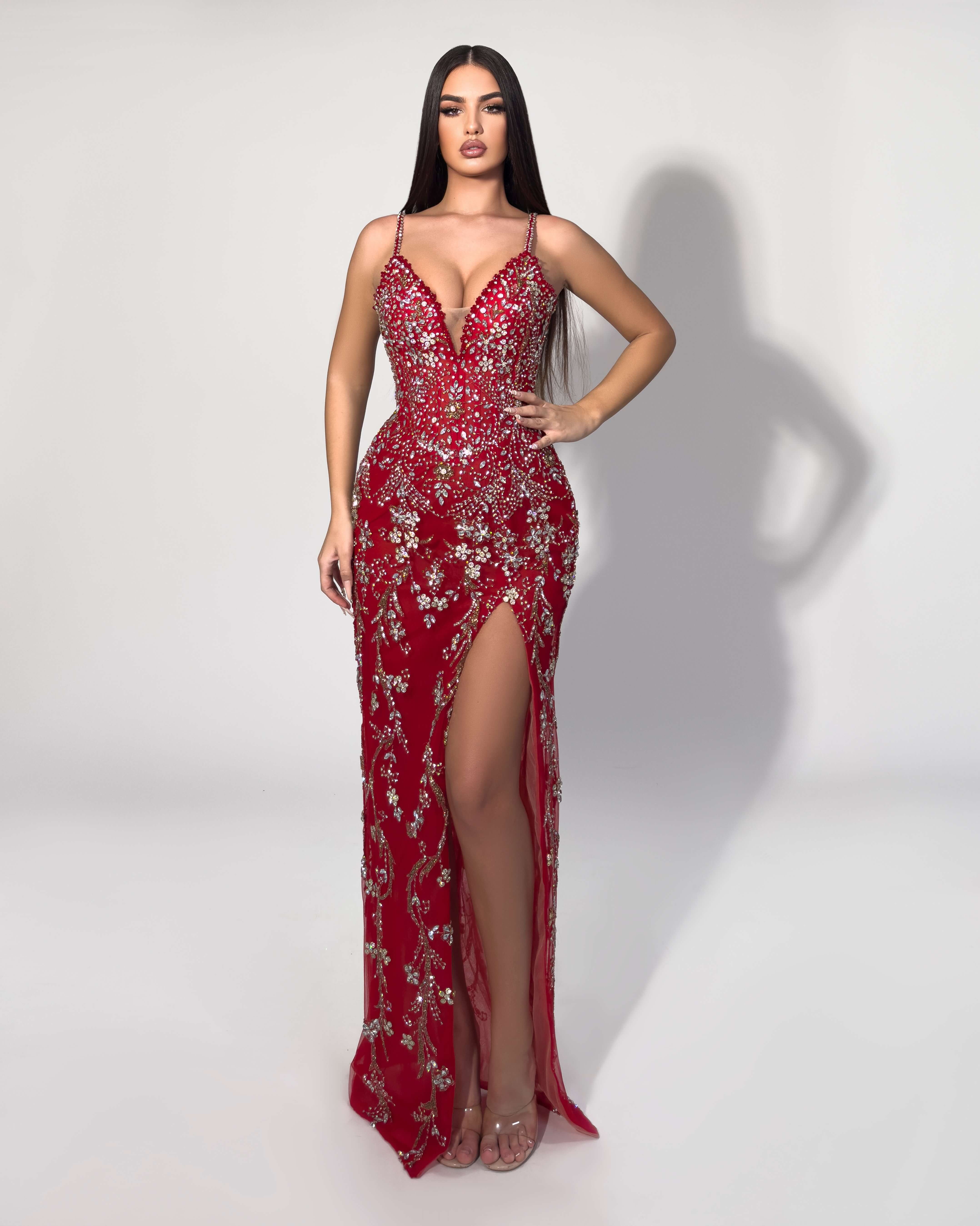 - Rich red hue in floor-length design