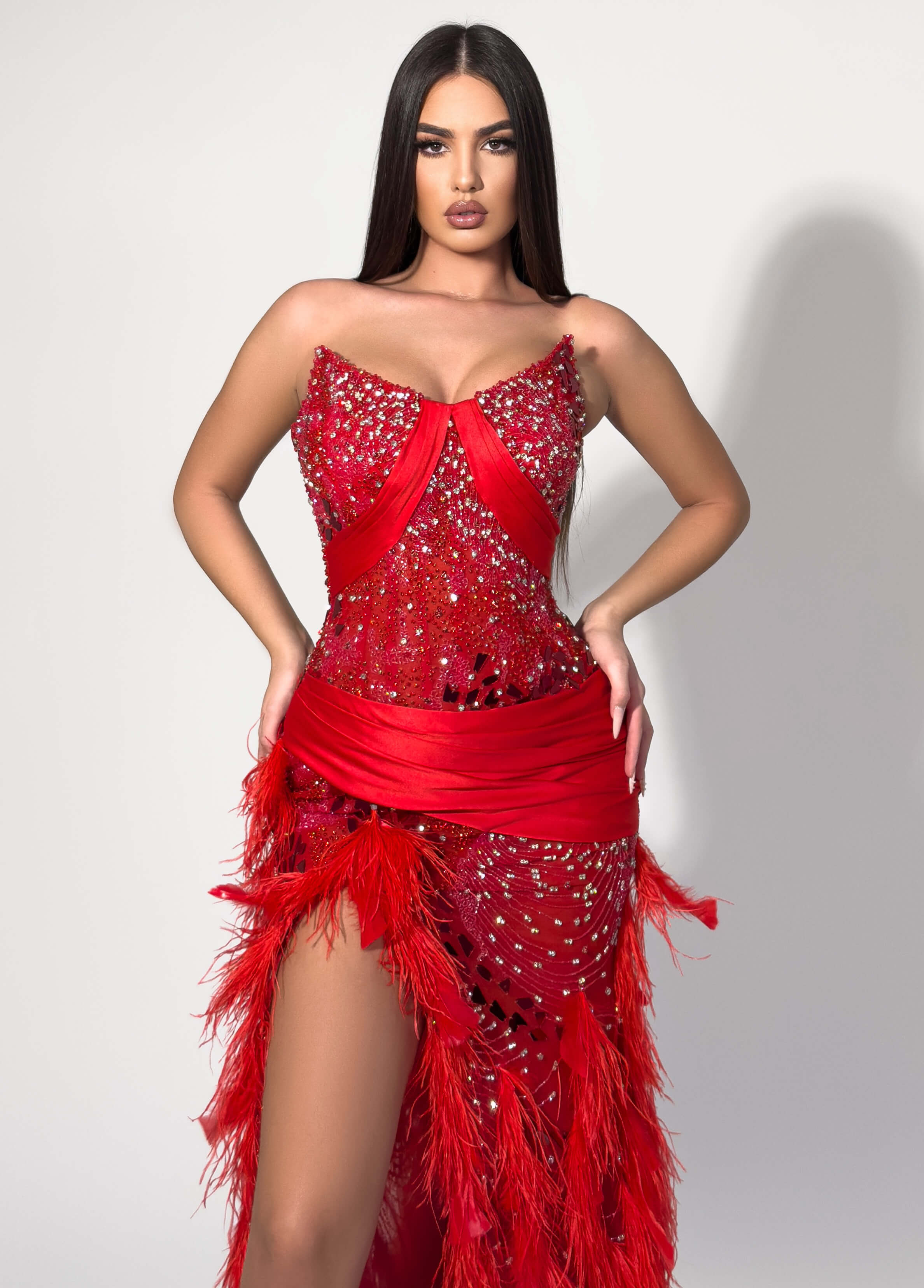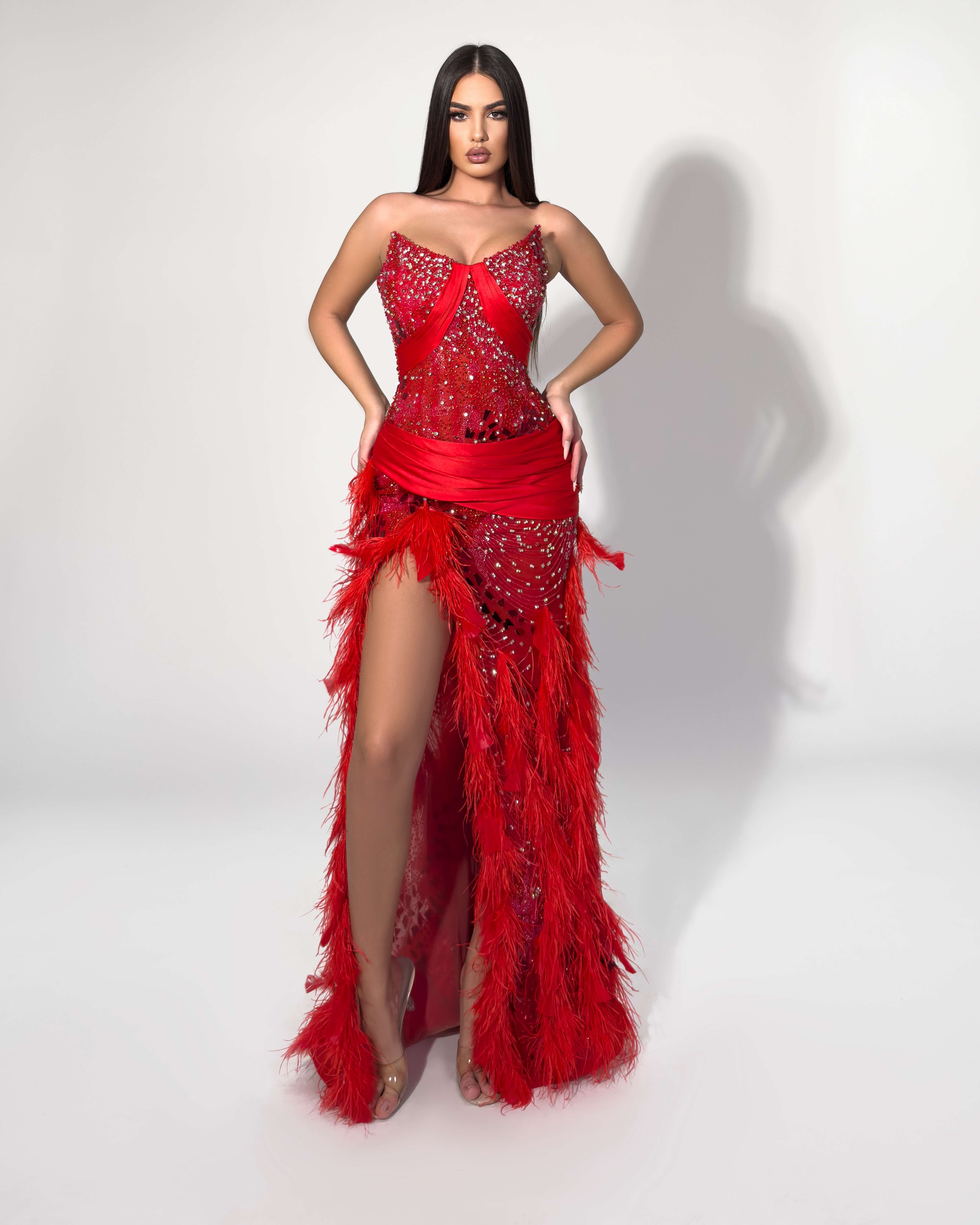 - Dramatic feather-trimmed skirt with high slit and satin sash