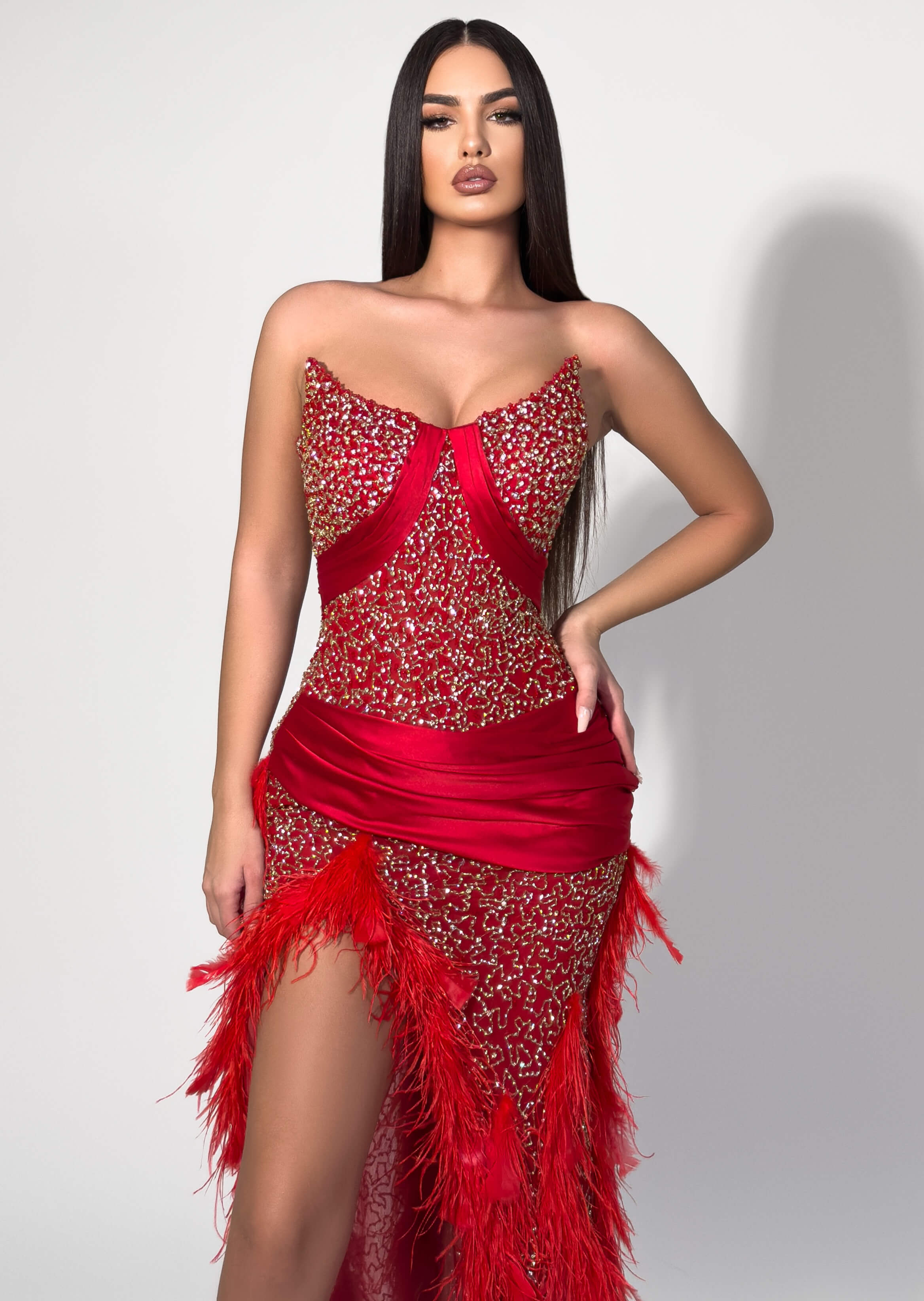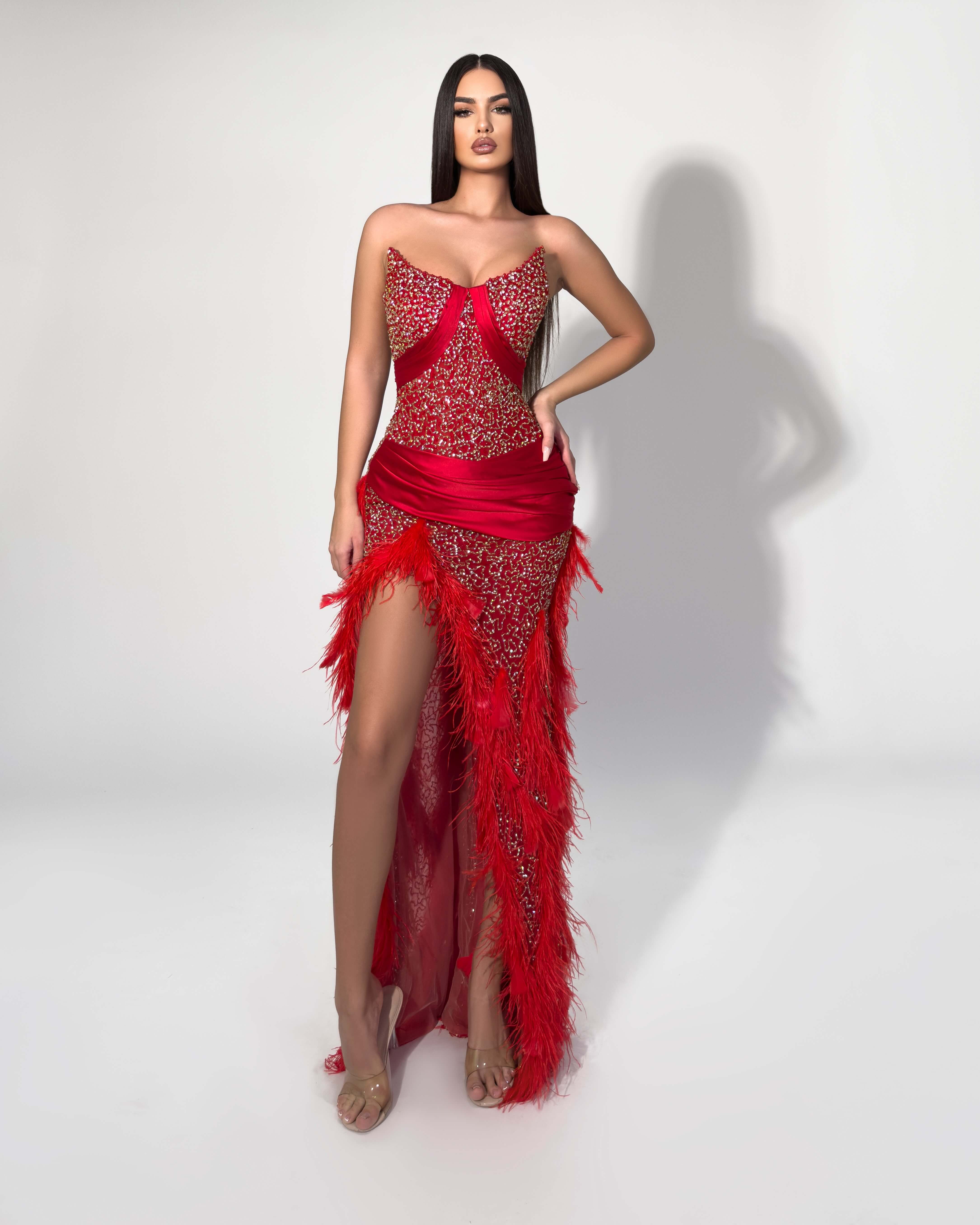 • Dramatic feather-trimmed skirt with high slit and satin sash