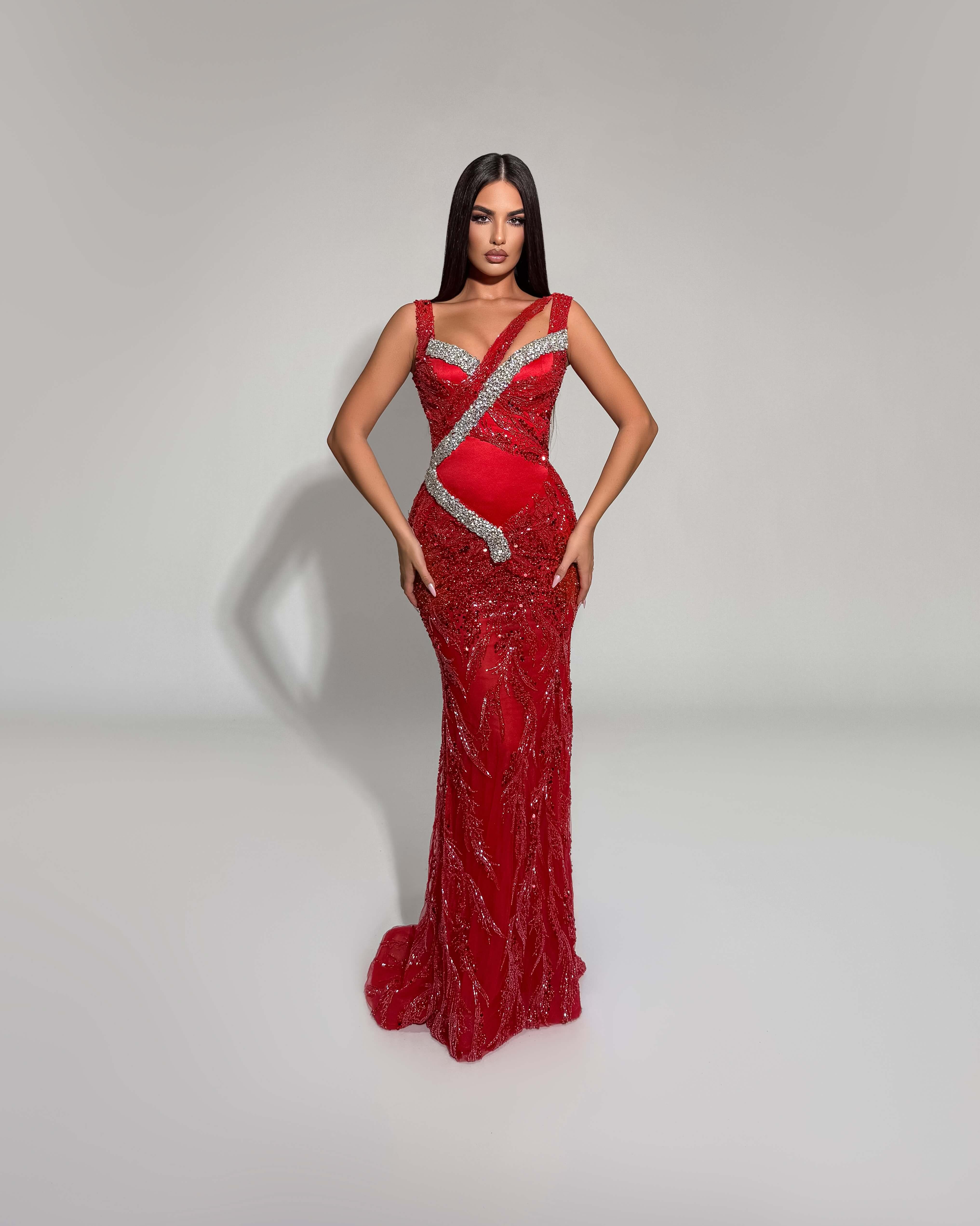 Elegant red gown featuring sparkling silver crystal lines that shape the silhouette.