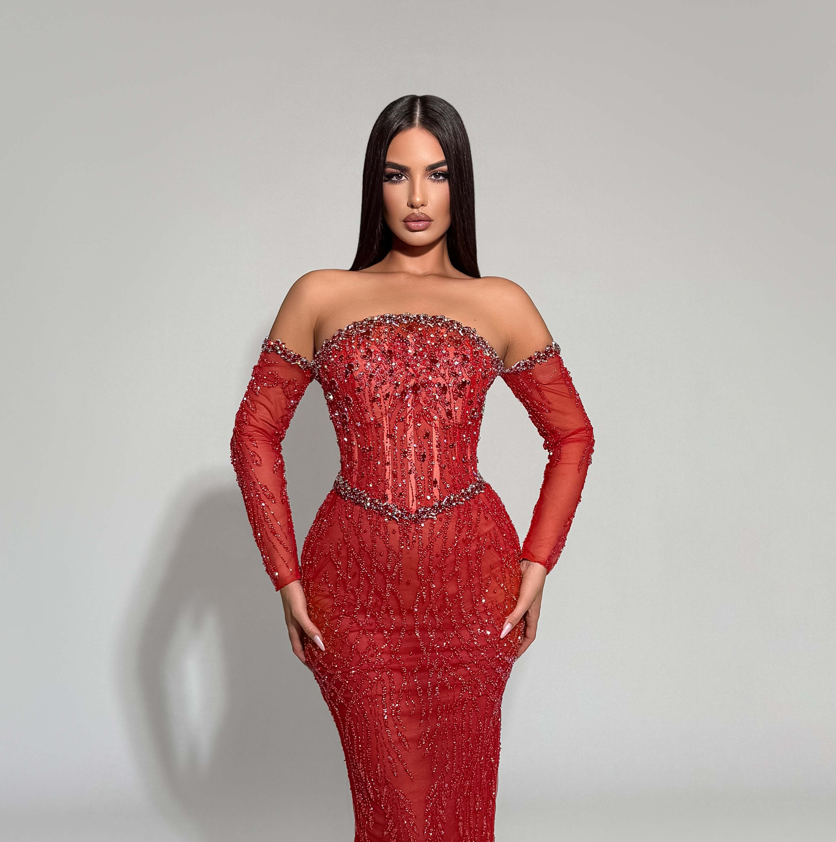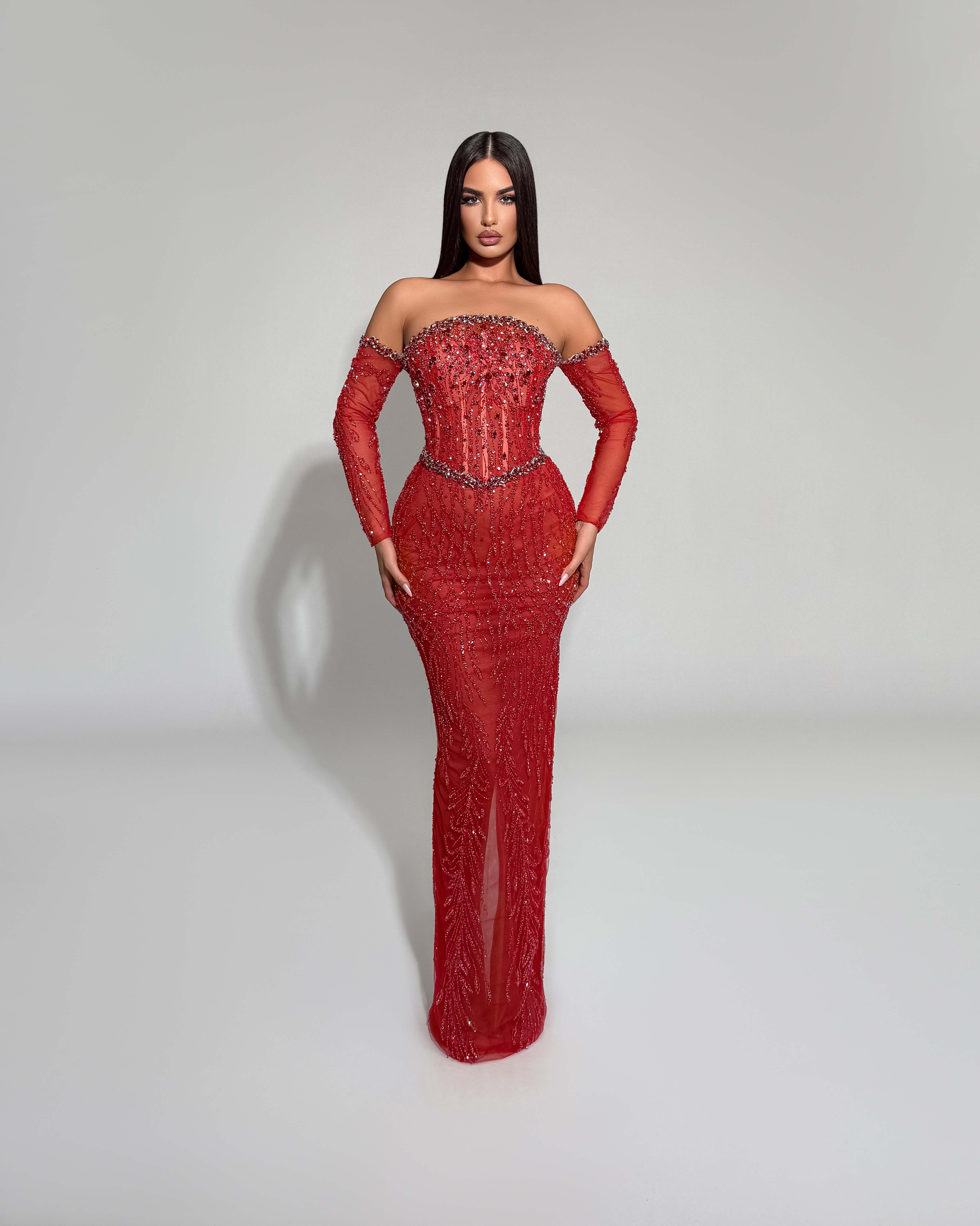 Elegant red gown featuring an off-shoulder neckline and sheer long sleeves.