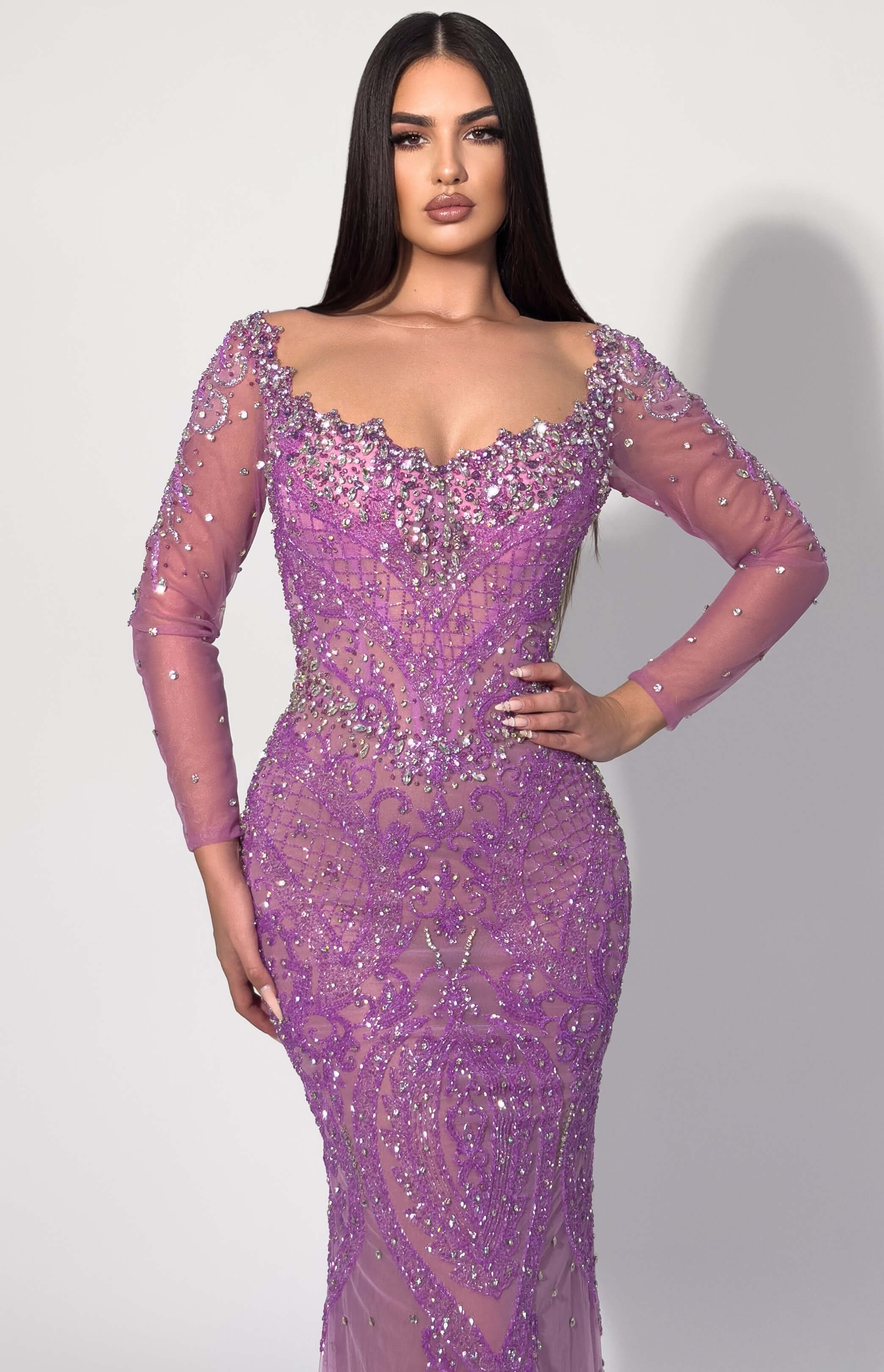 - Figure-sculpting silhouette with allover lavender and crystal beadwork