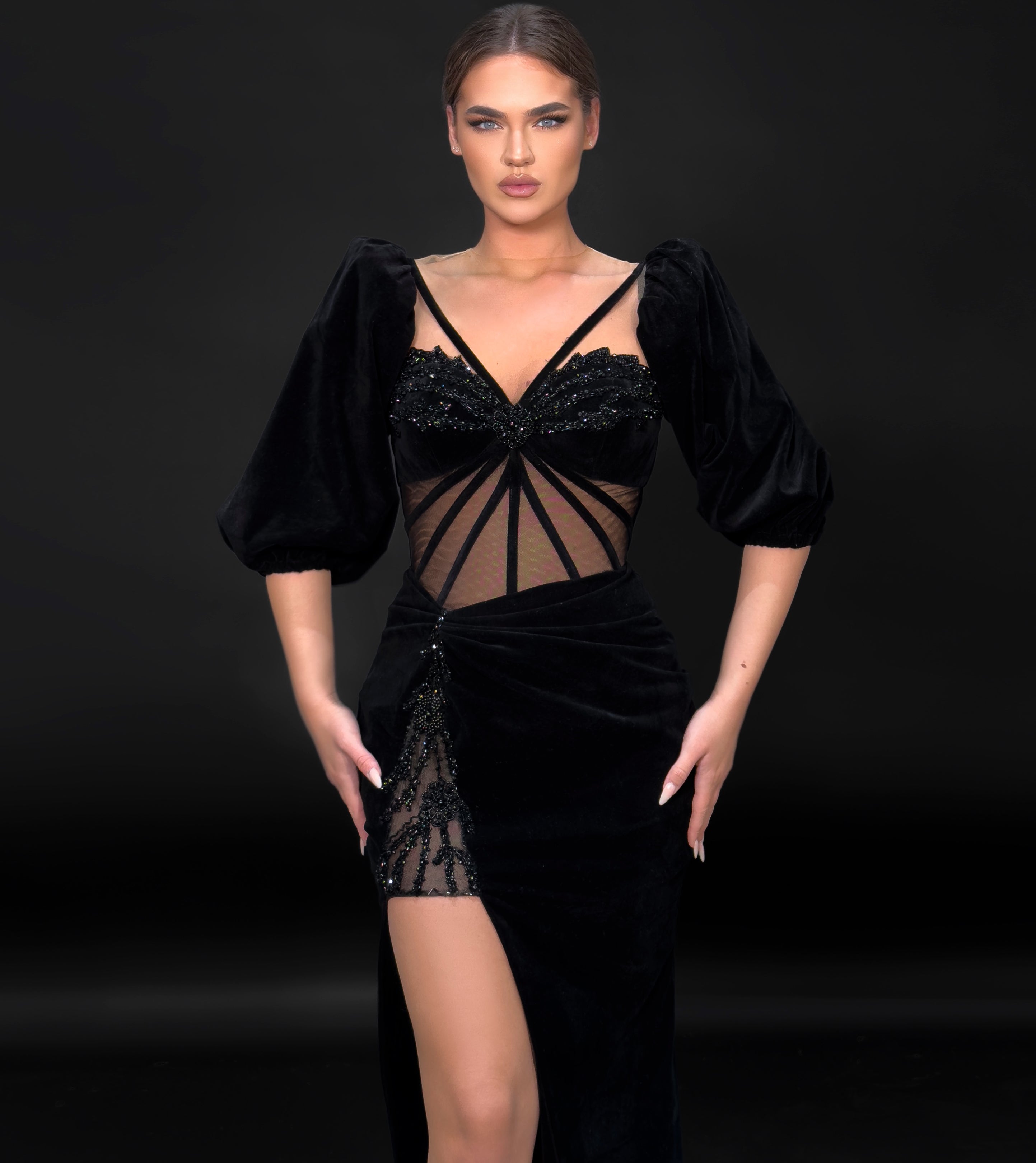 - Strategic sheer panels balanced with opaque velvet for refined sensuality