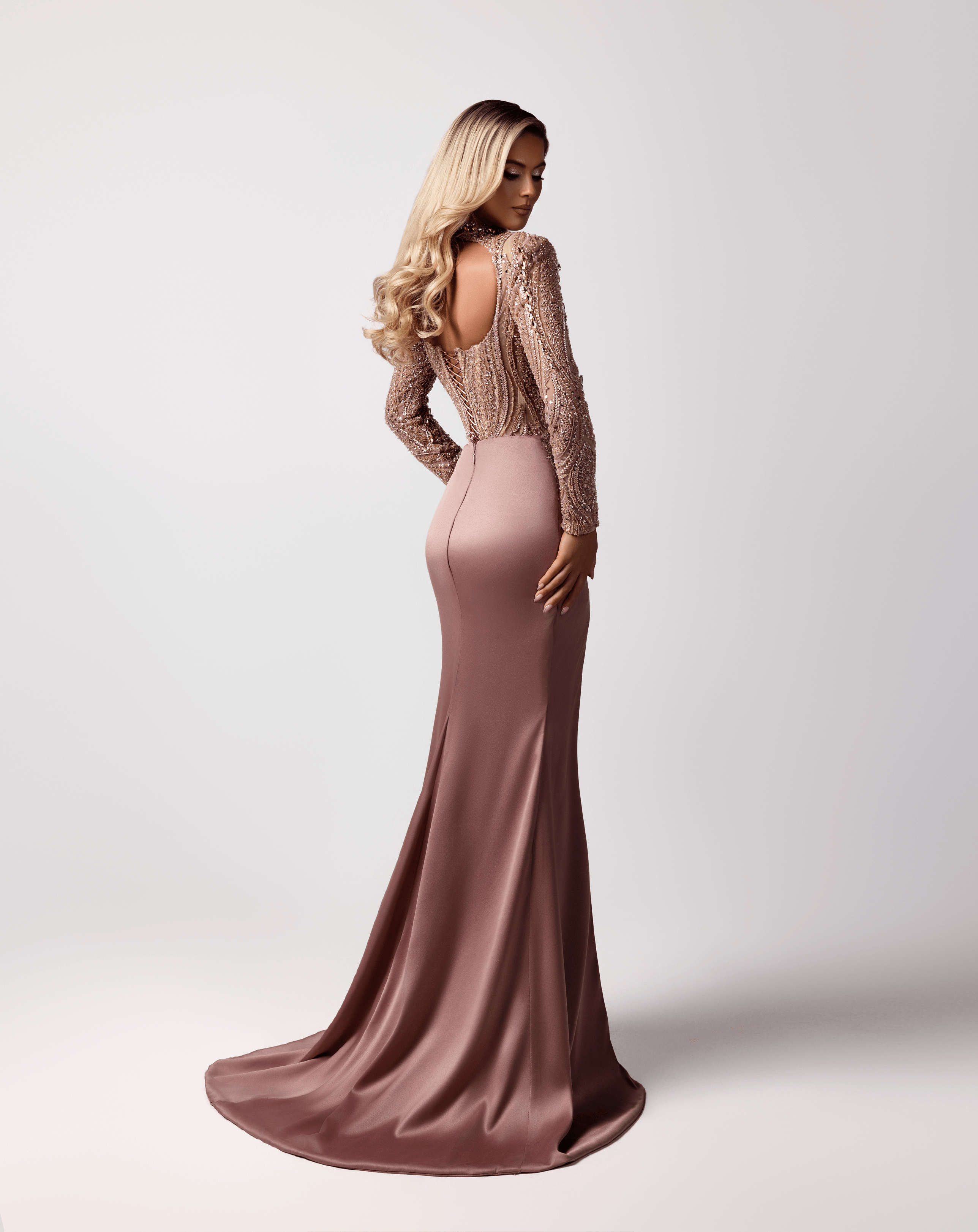 - Fully beaded long sleeves and bodice with intricate rose gold crystal detailing