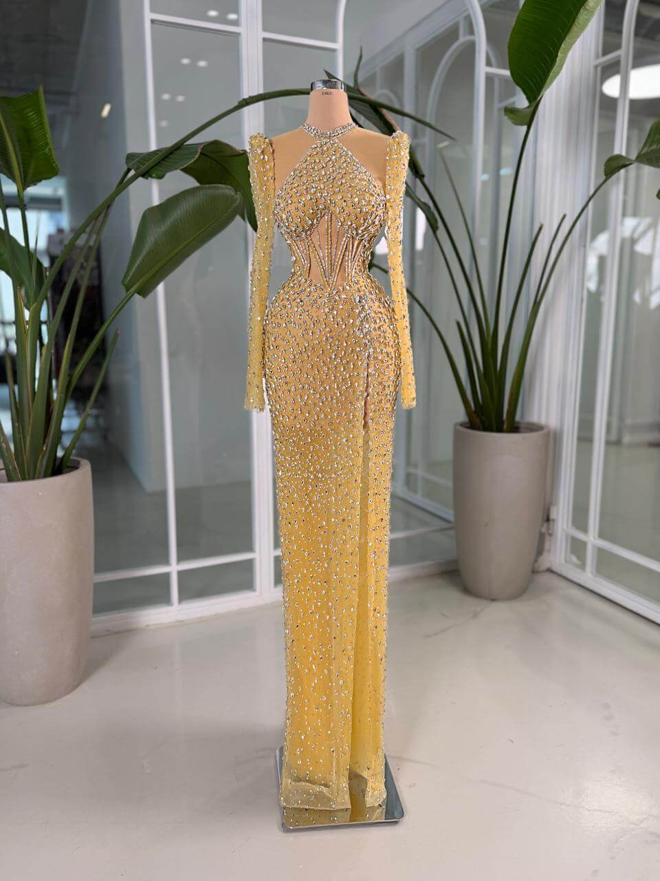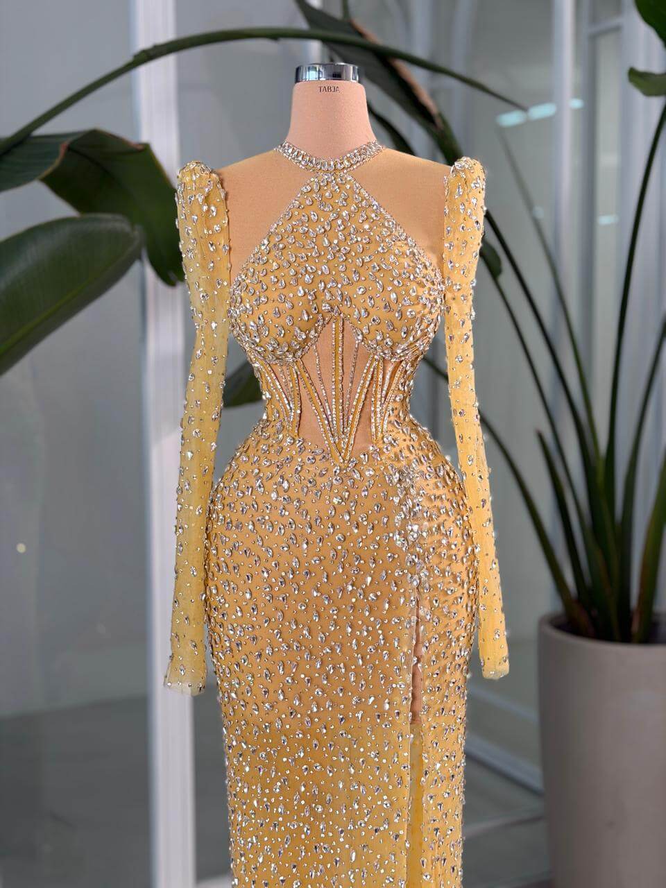 - Fully hand-beaded with gold crystals and intricate detailing throughout the bodice and sleeves