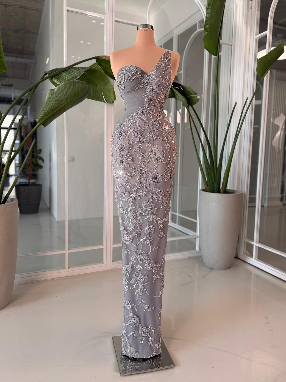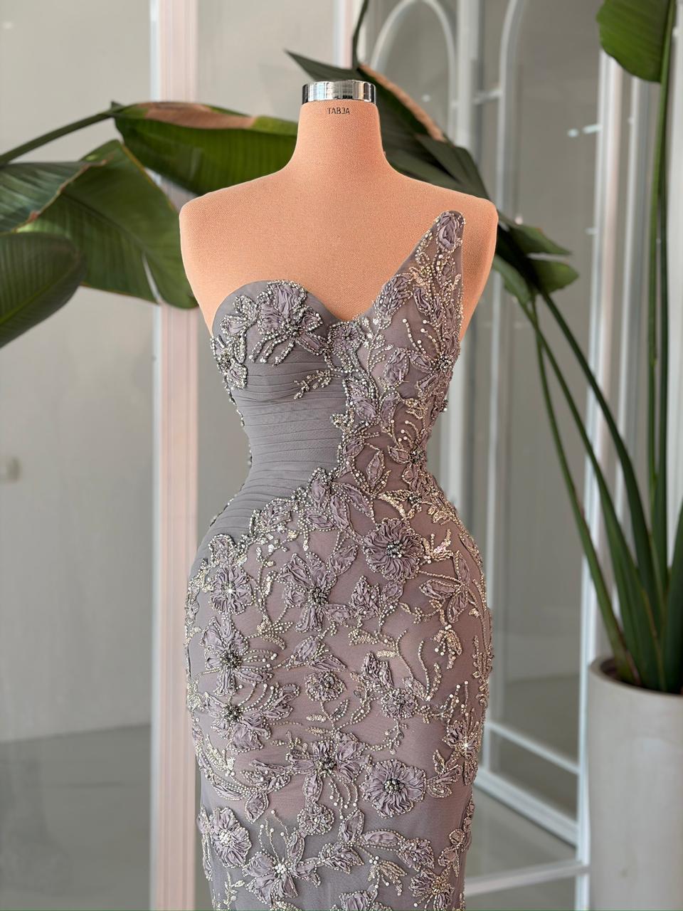 - Figure-hugging silhouette in luxurious dove grey, perfect for galas, formal events, and unforgettable evenings
