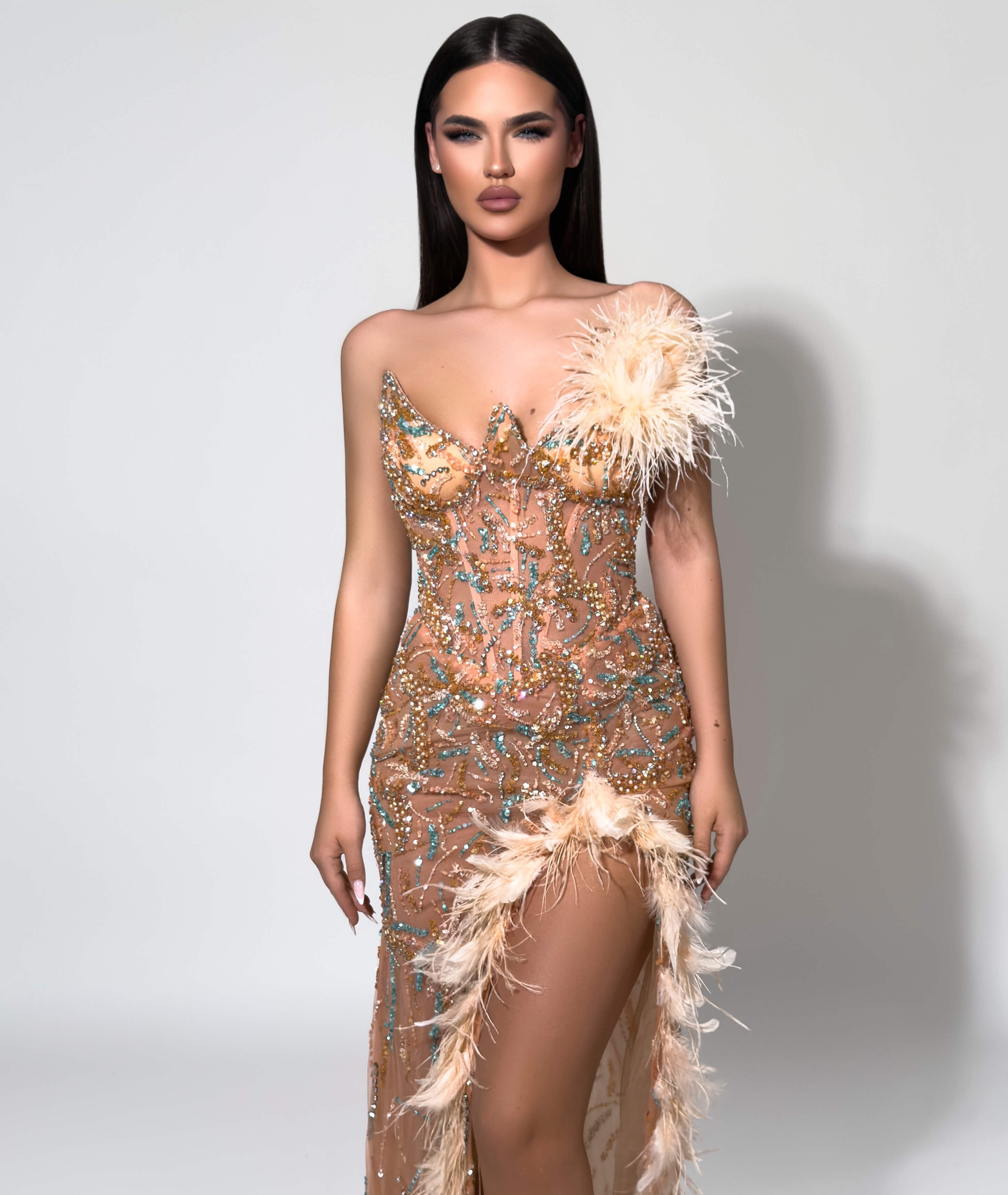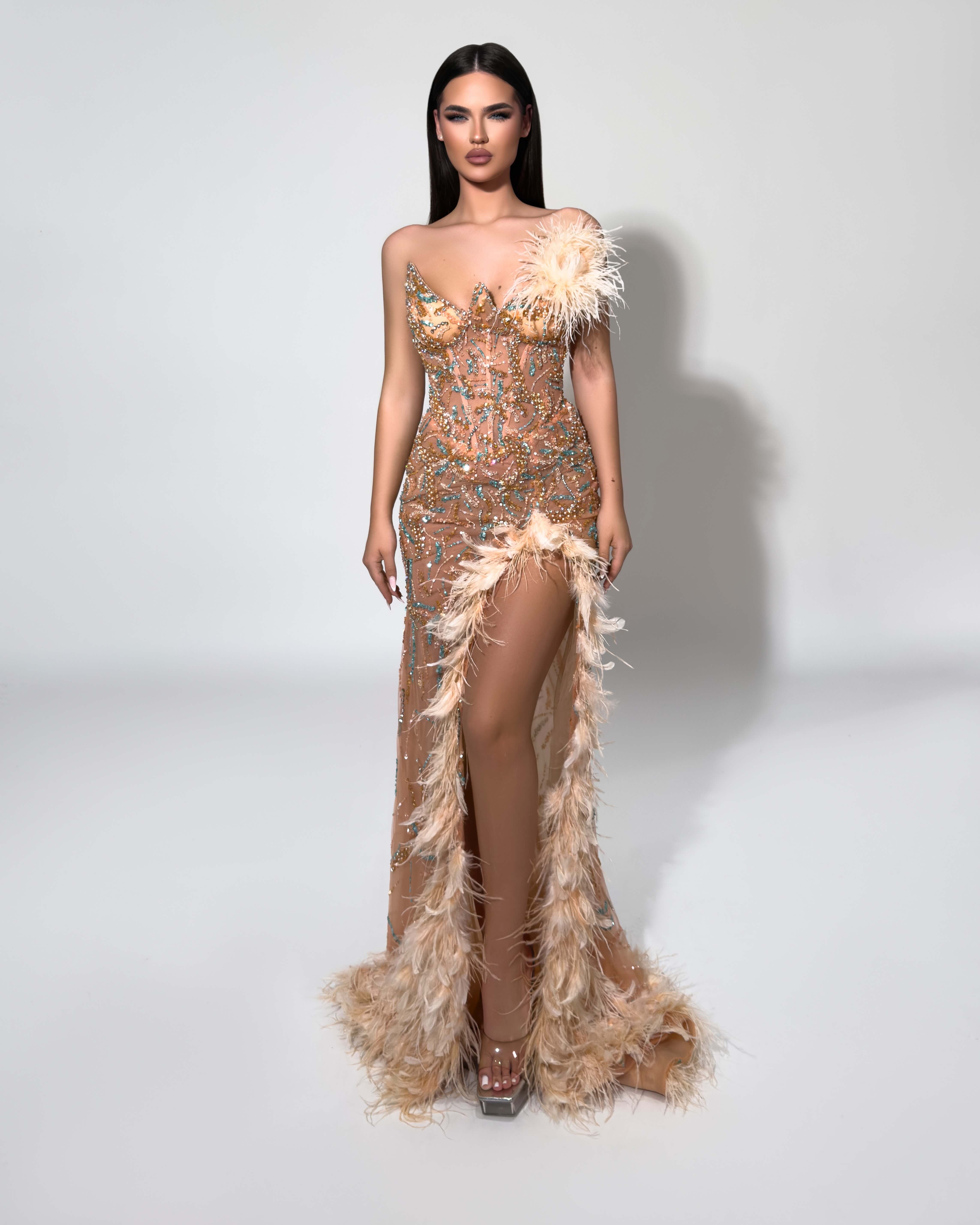 - Show-stopping champagne gown with crystal embellishments and luxurious feather accents