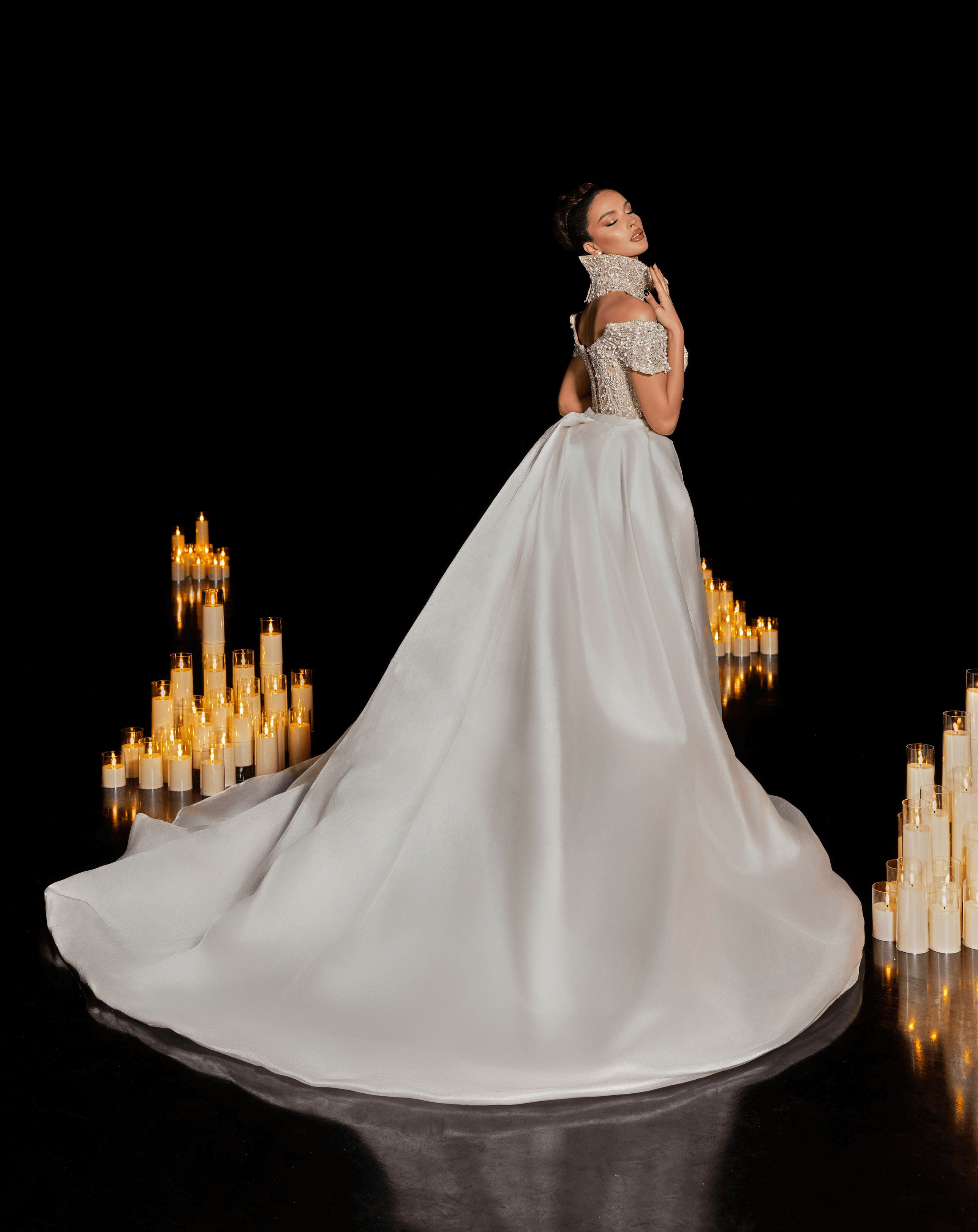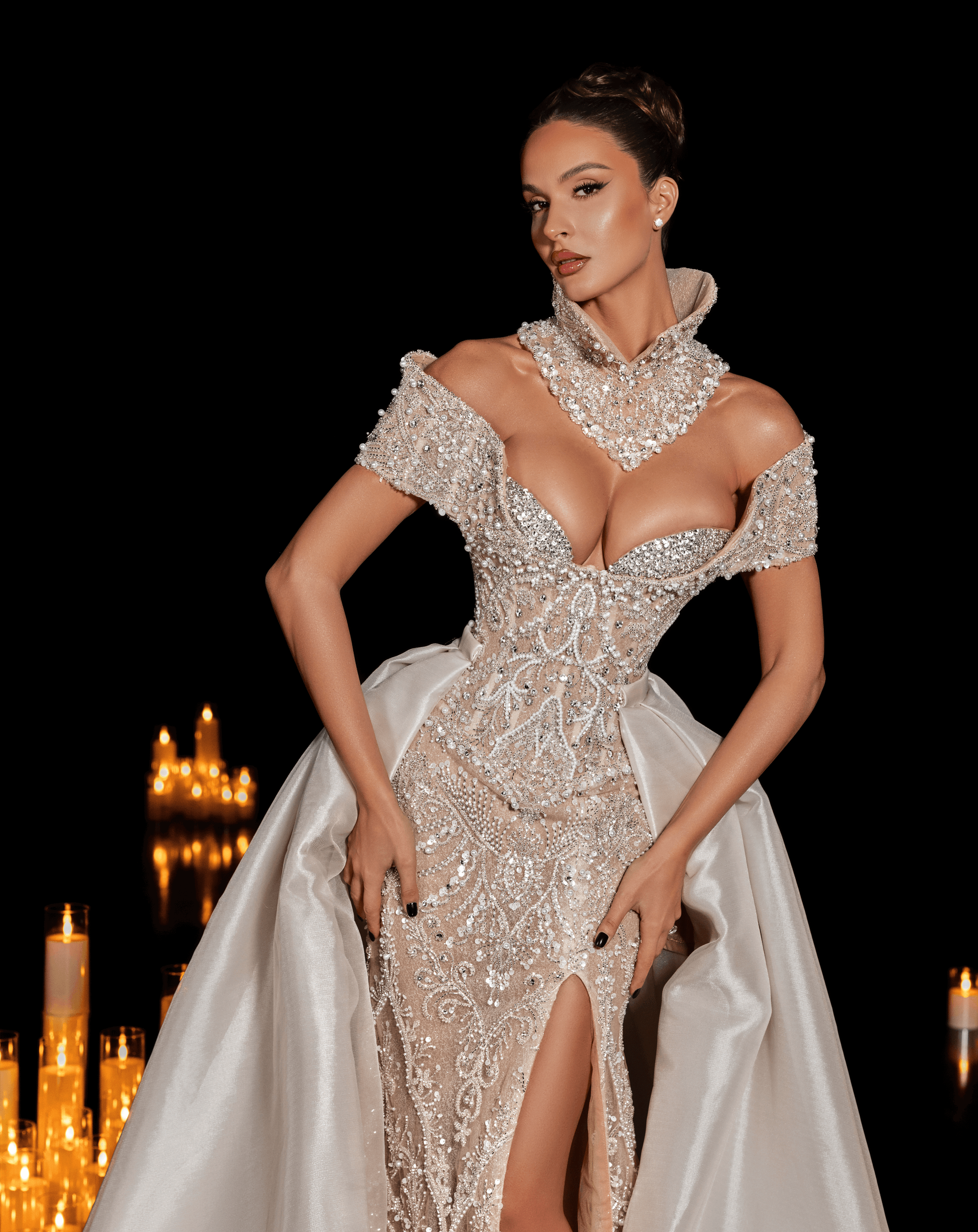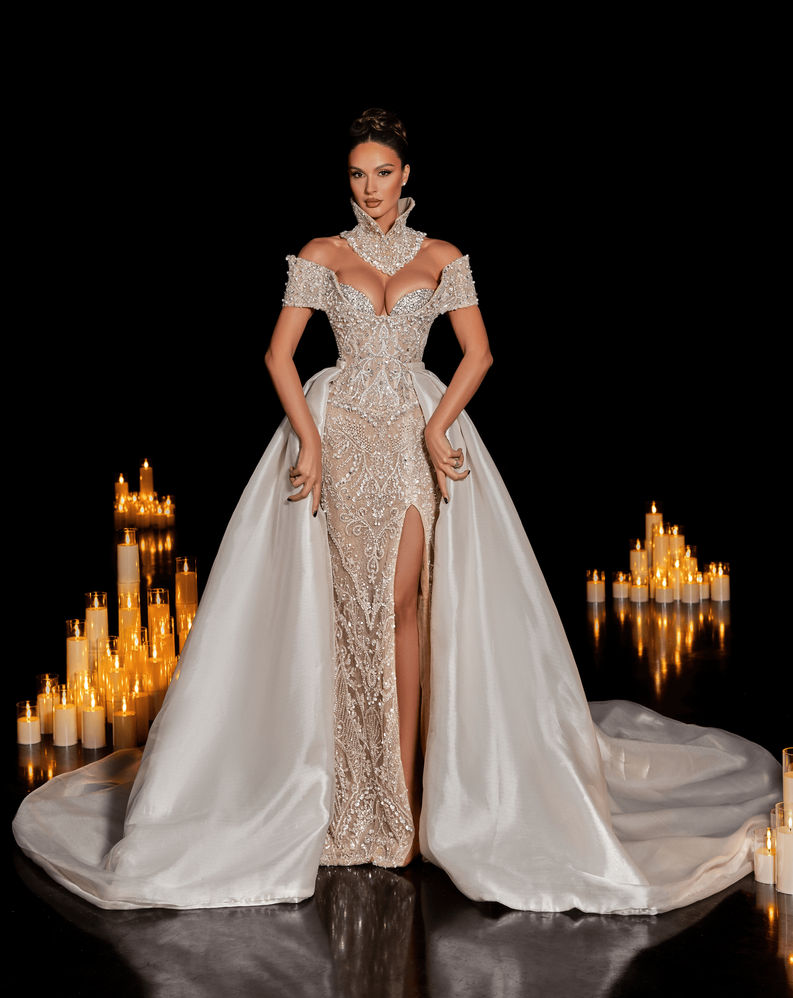 - Figure-hugging silhouette with thigh-high slit and detachable ball gown overskirt for versatile bridal drama
