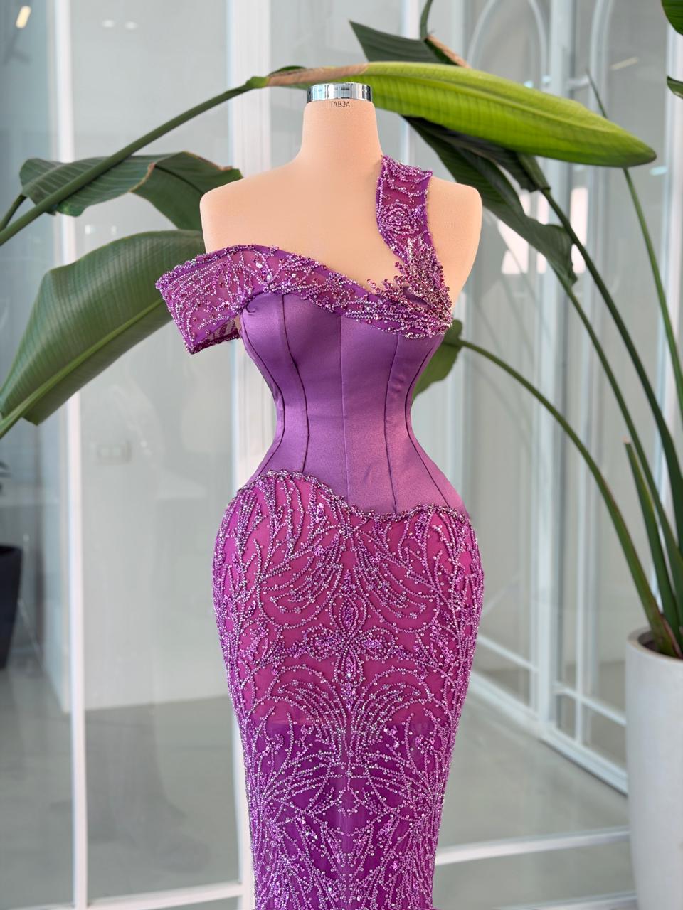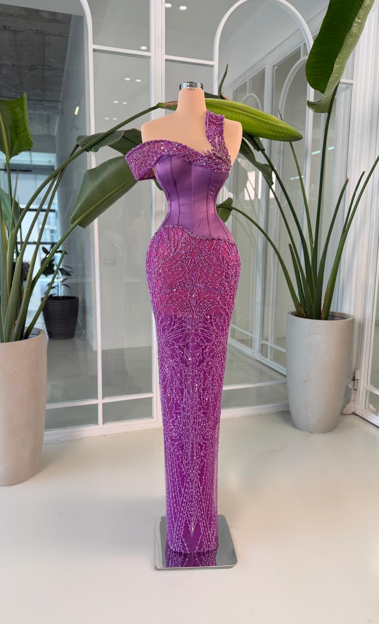 - One-shoulder design with beaded strap and structured satin corset bodice