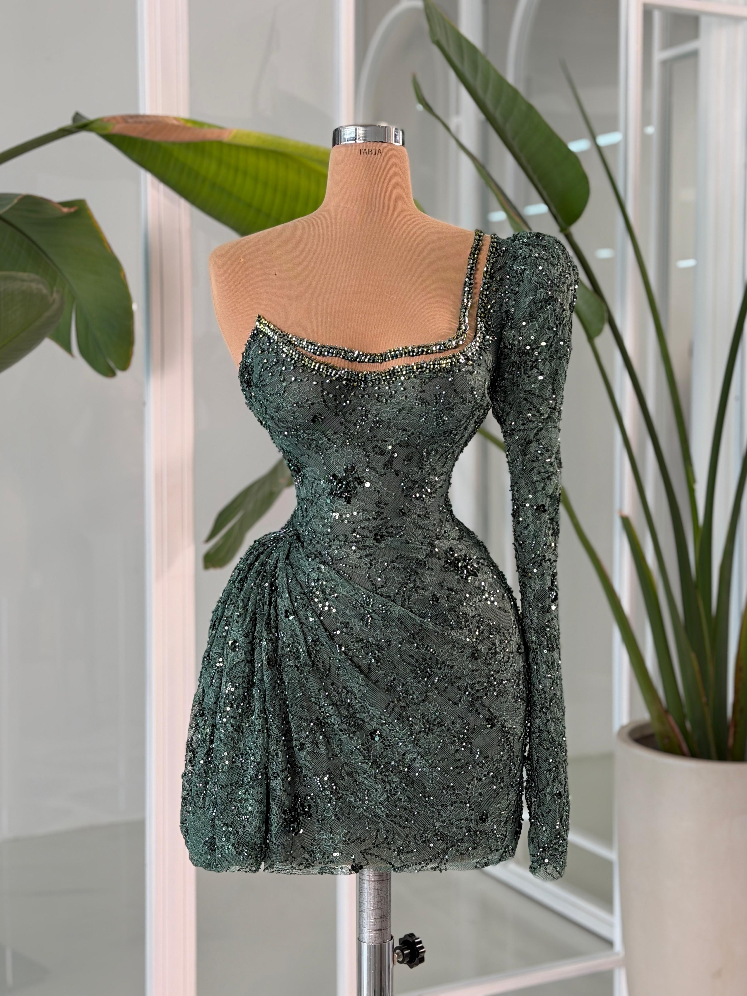 - Luxurious deep emerald hue completely adorned with shimmering sequins and beading in an intricate lace-inspired pattern