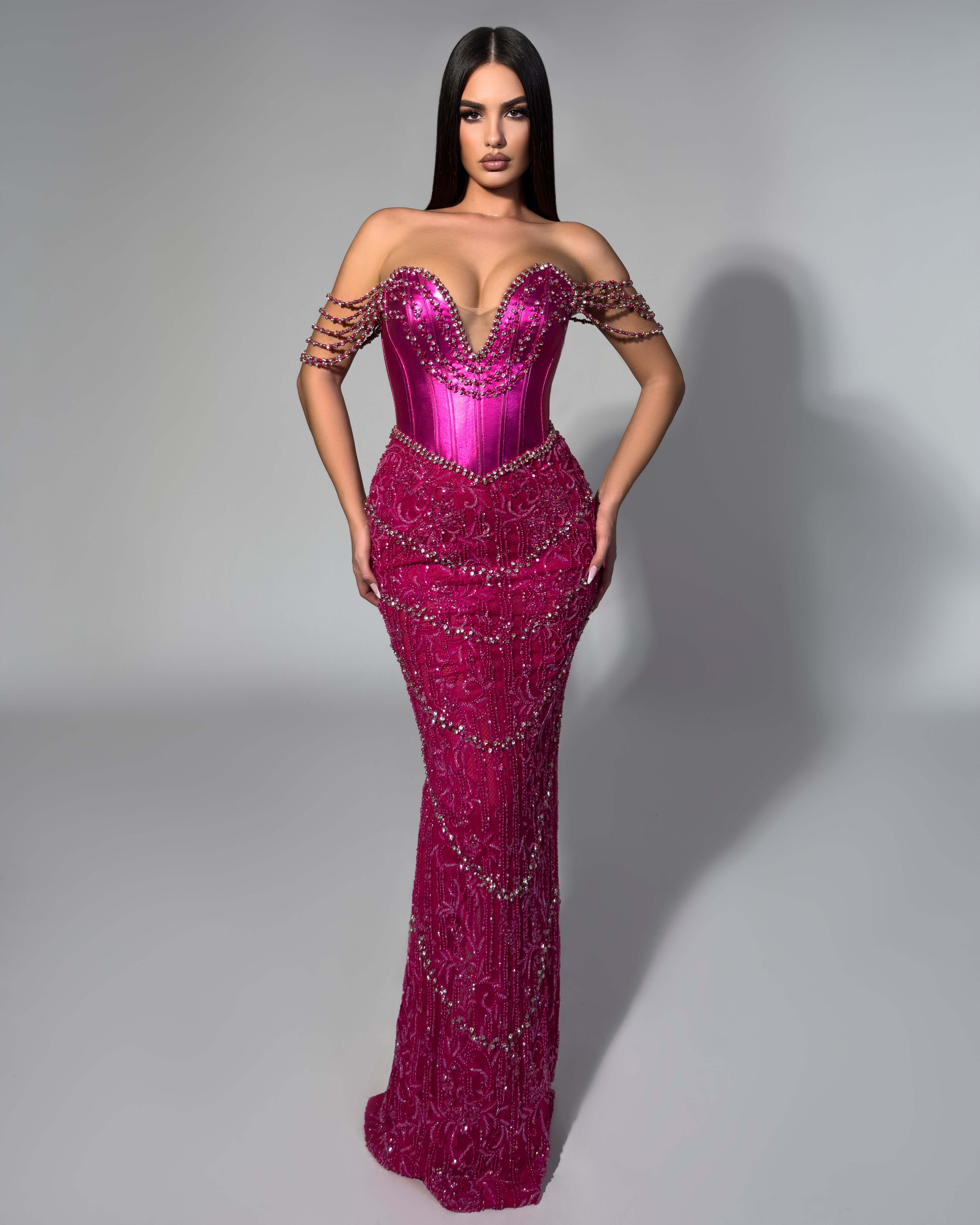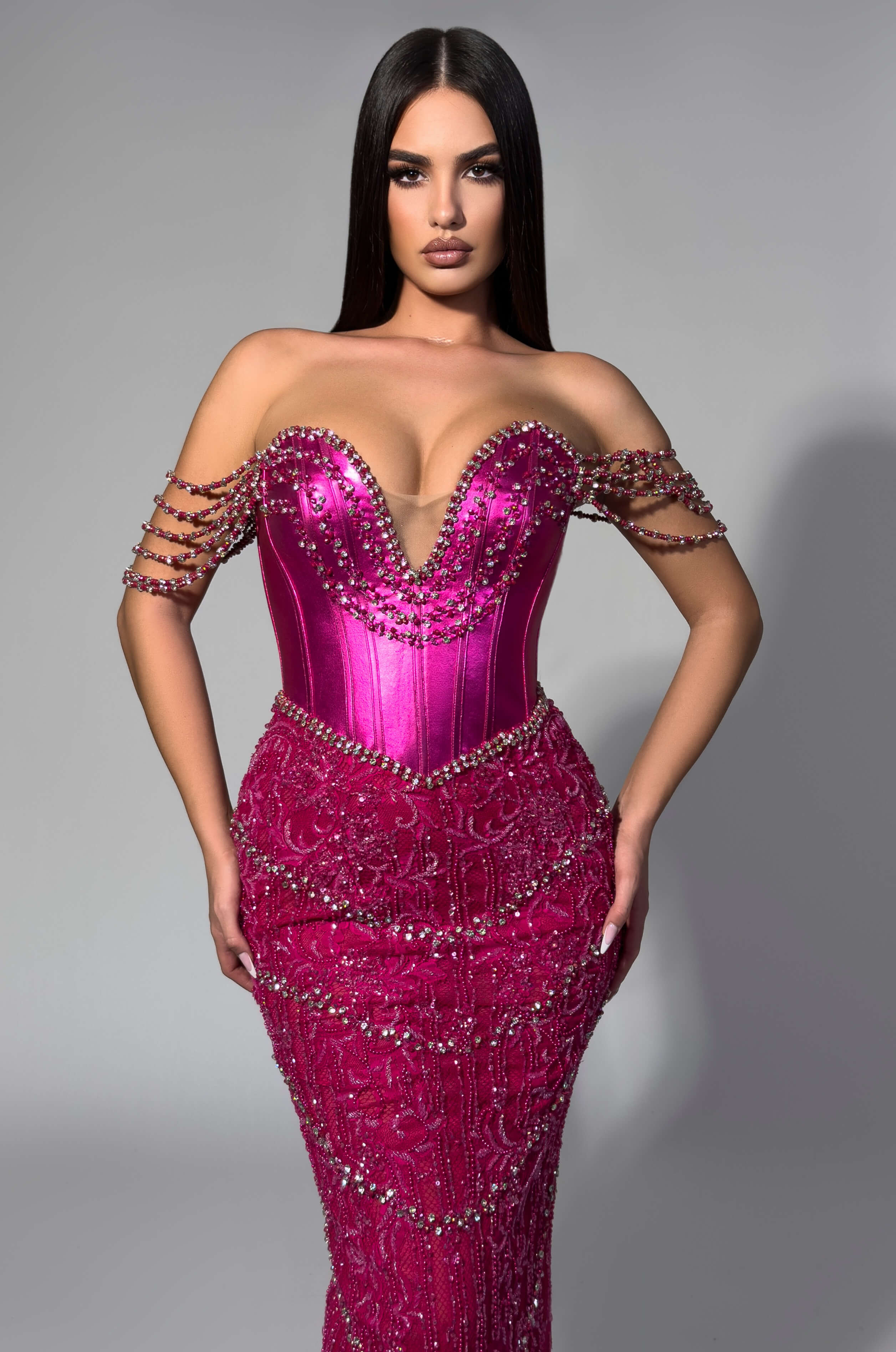 Command the room in this opulent magenta gown featuring a crystal-embellished corset bodice with off-shoulder beaded sleeves. The figure-sculpting silhouette with intricate beadwork throughout creates a regal, unforgettable presence at any high-profile event.