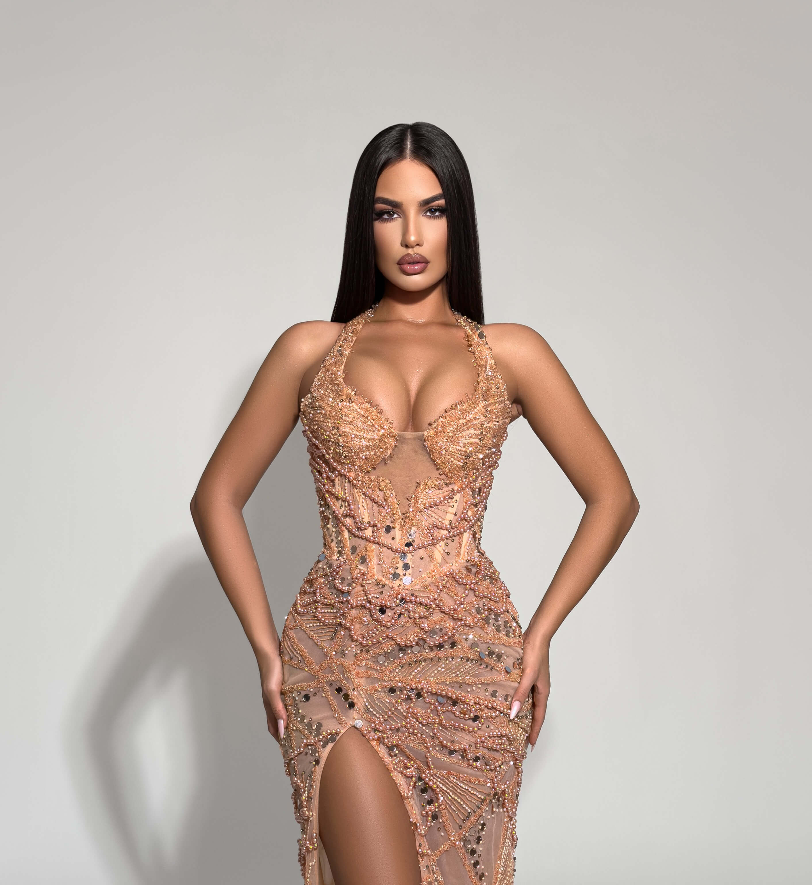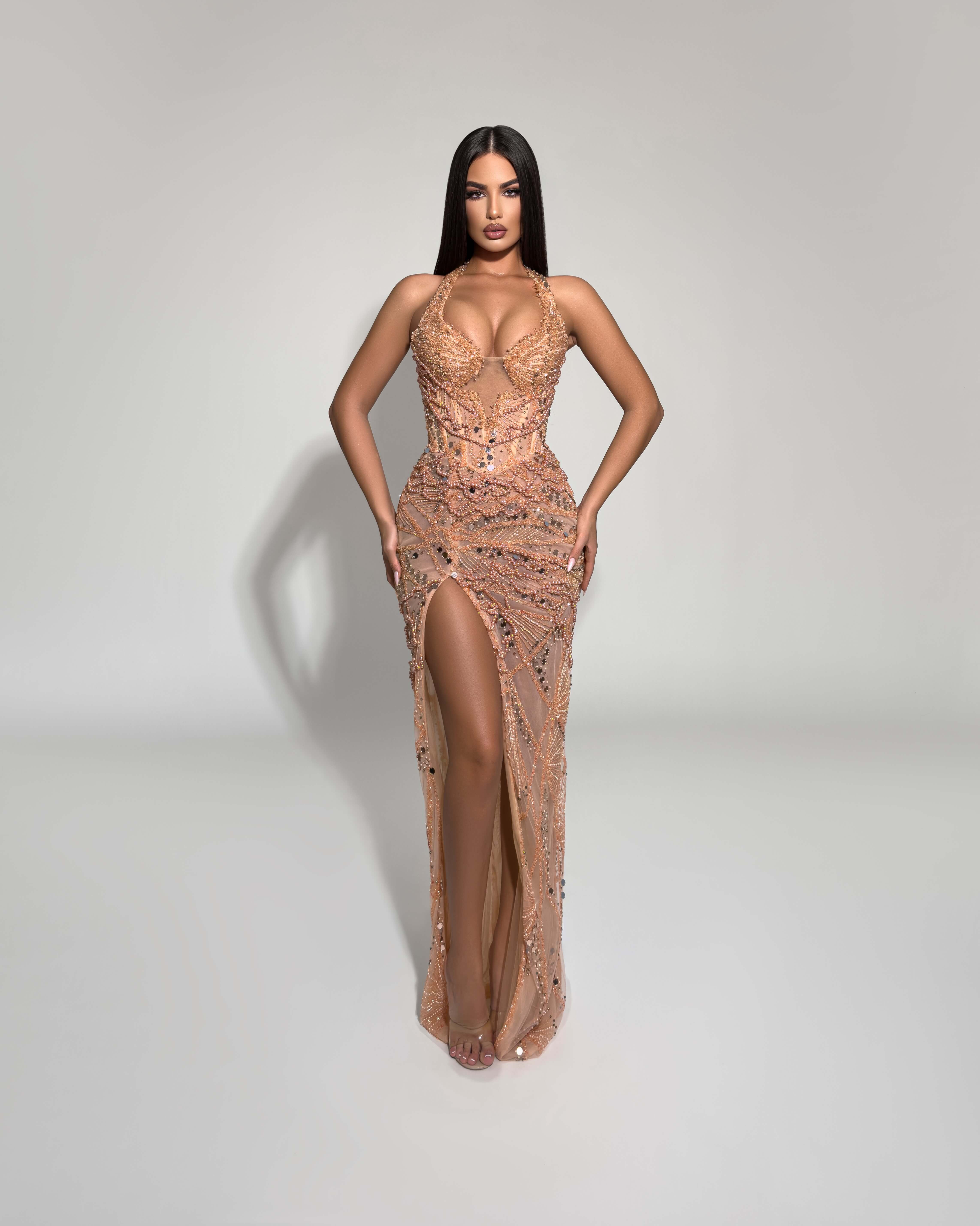 Sculpted nude gown with intricate hand-applied crystals and beadwork.