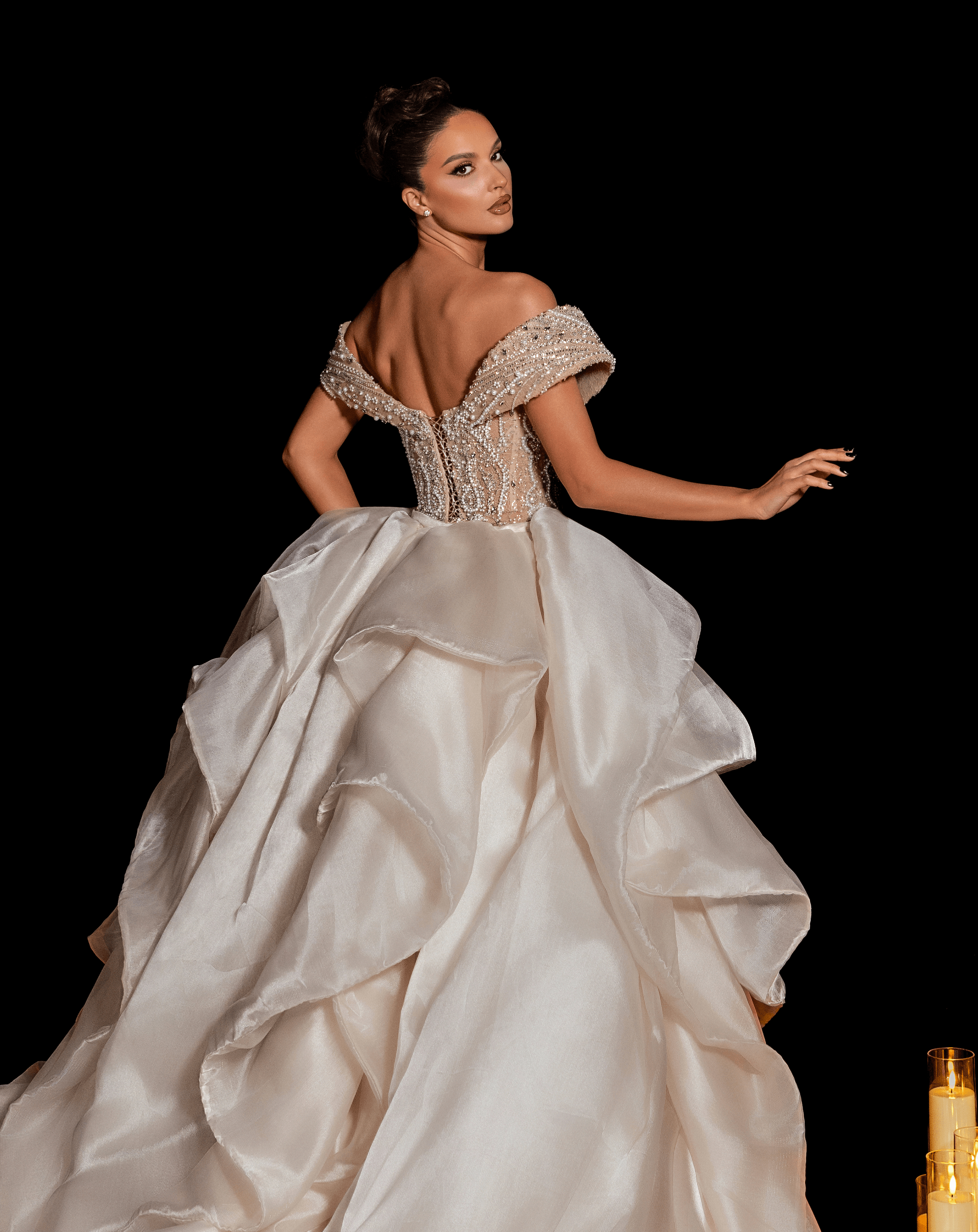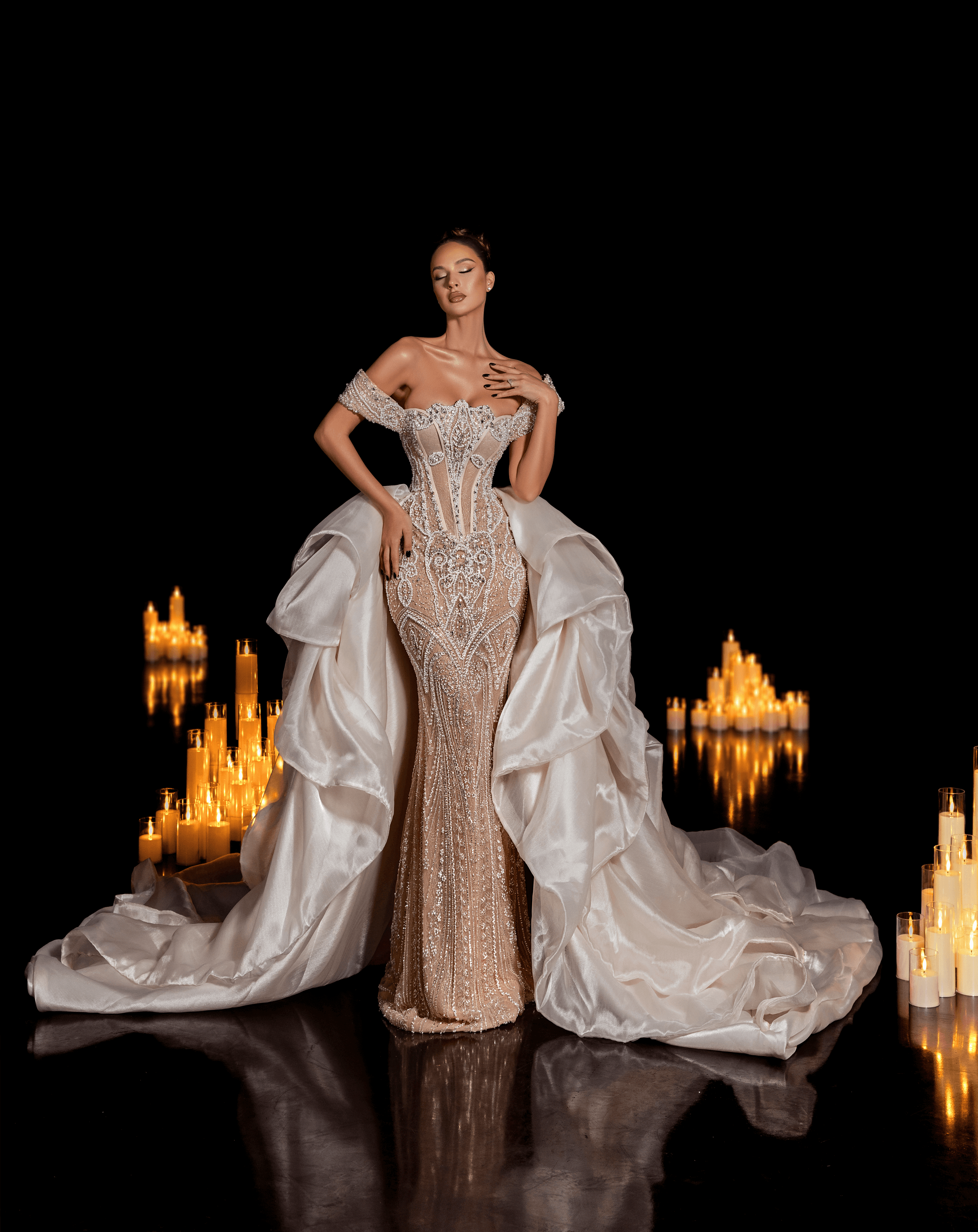 - Dramatic detachable overskirt with voluminous ruffled train for a show-stopping ceremony entrance