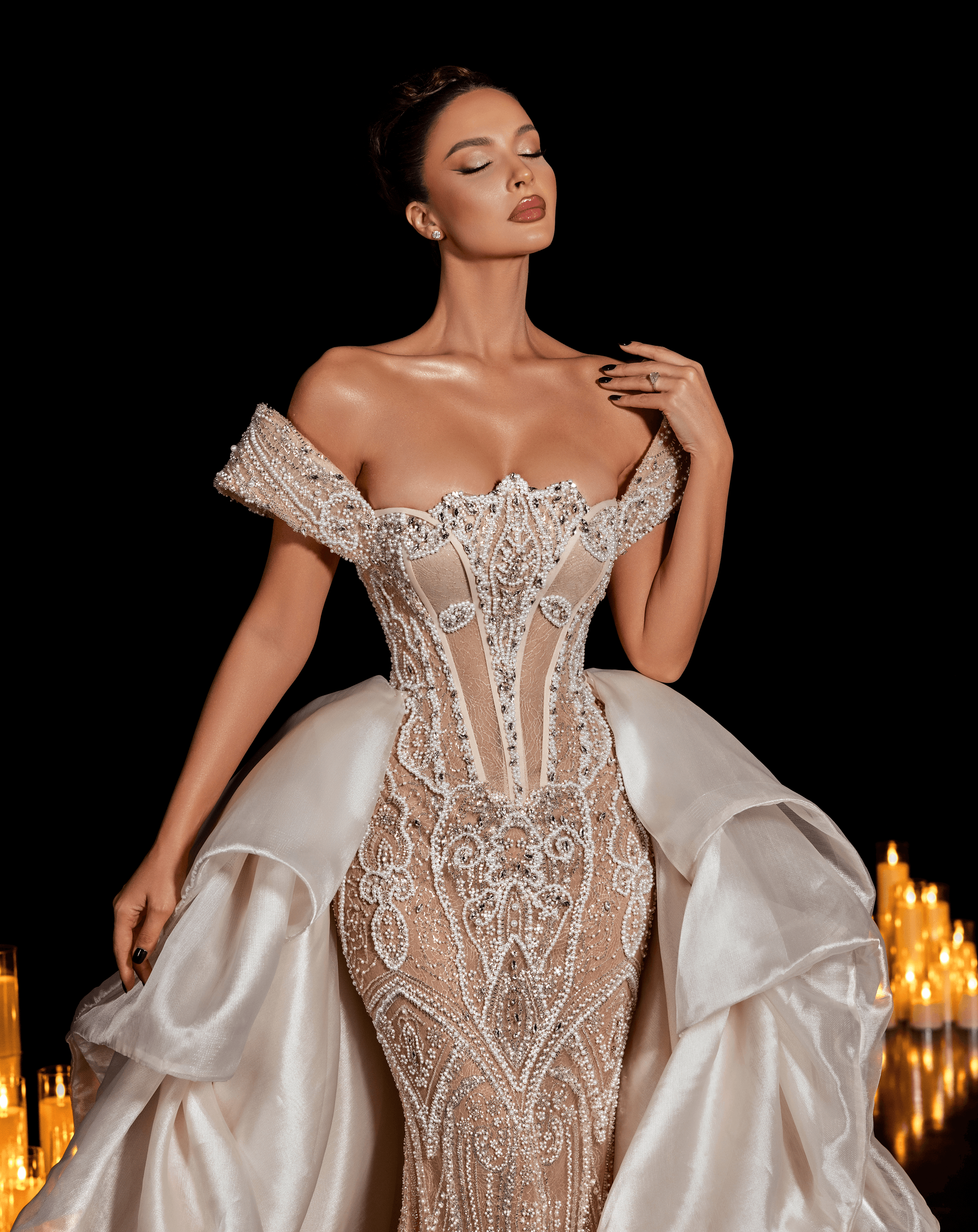 - Off-shoulder sweetheart neckline with figure-sculpting mermaid silhouette for timeless bridal elegance