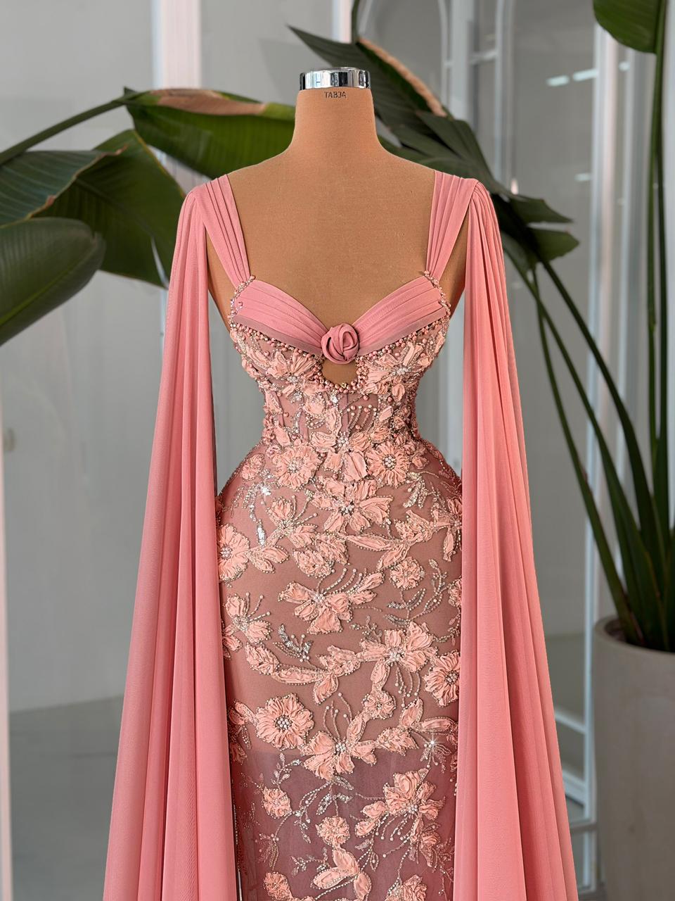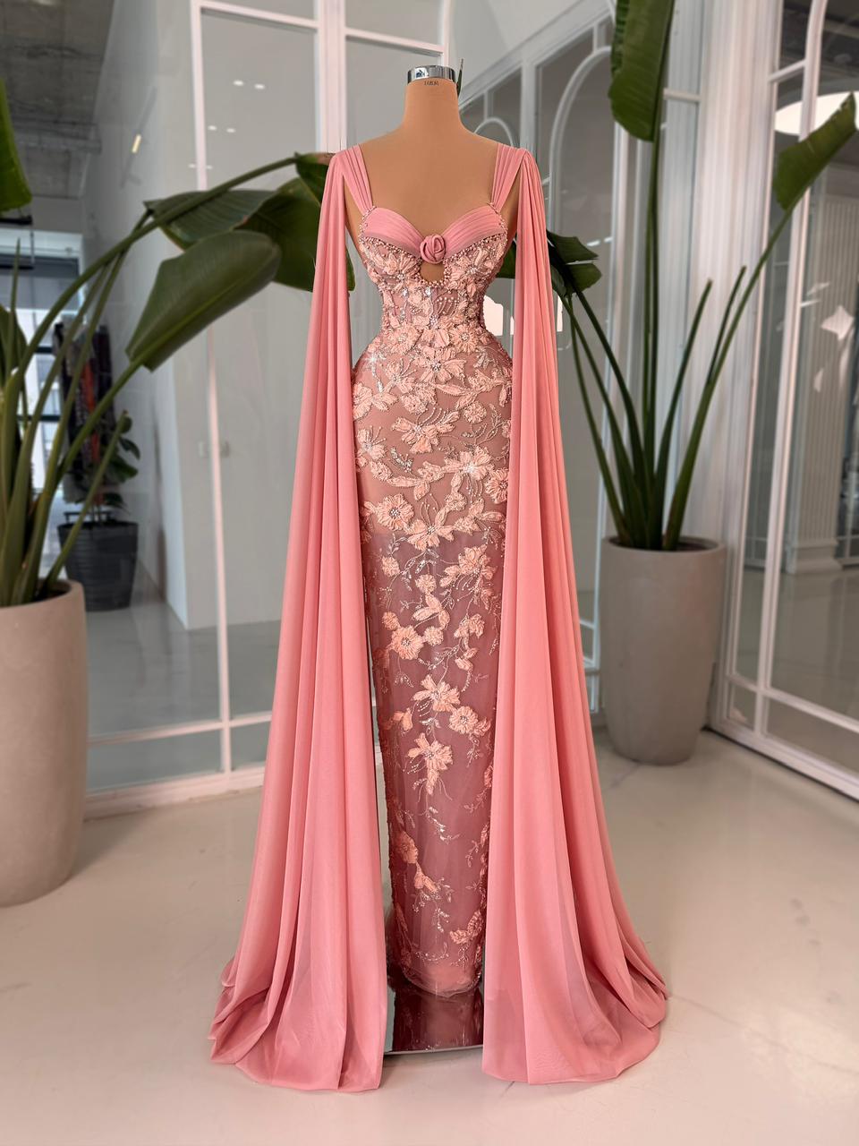 - Dramatic floor-length chiffon sleeves cascade from the shoulders, adding movement and red-carpet glamour