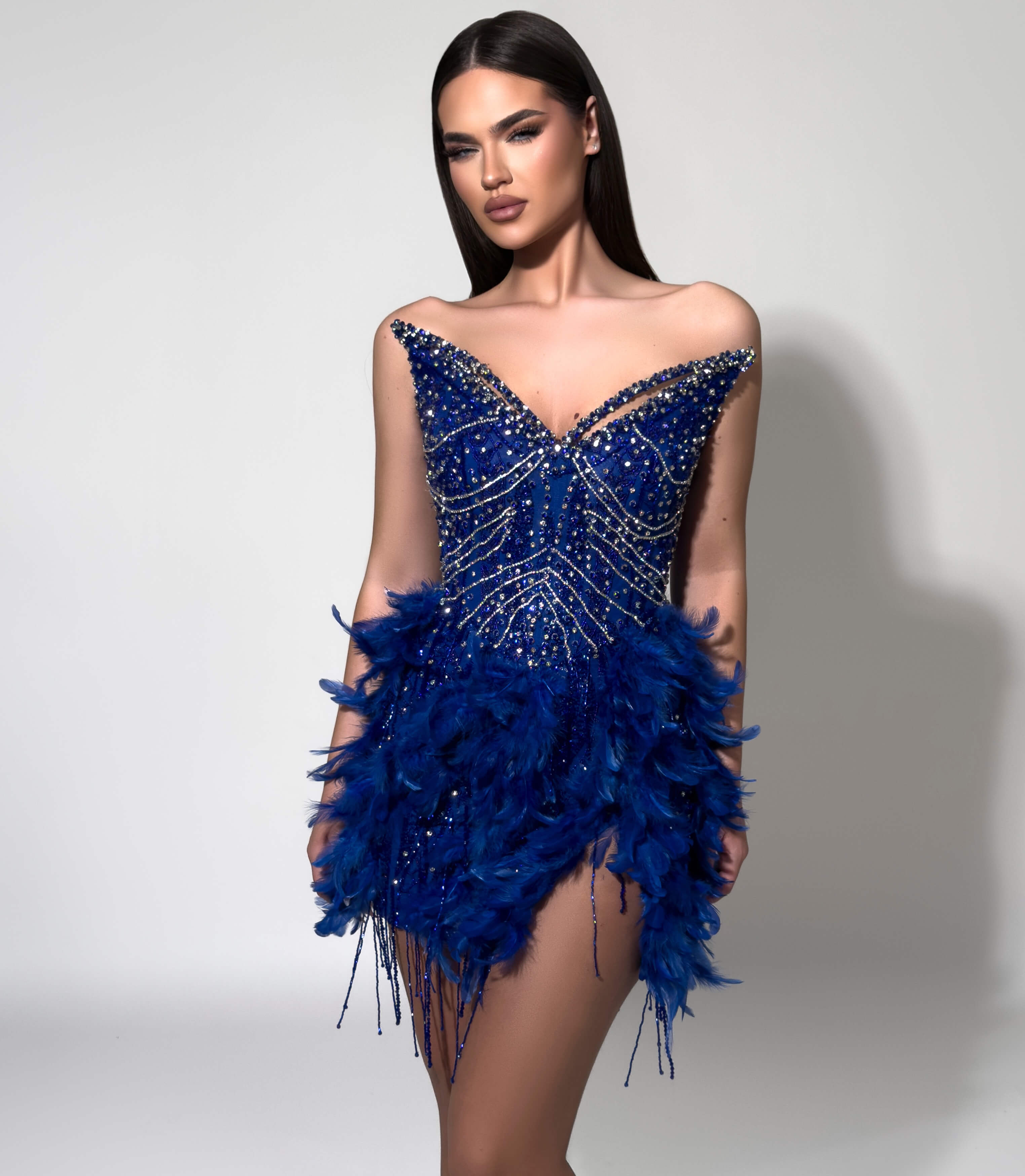 - Dramatic feather skirt with crystal fringe detailing for show-stopping movement